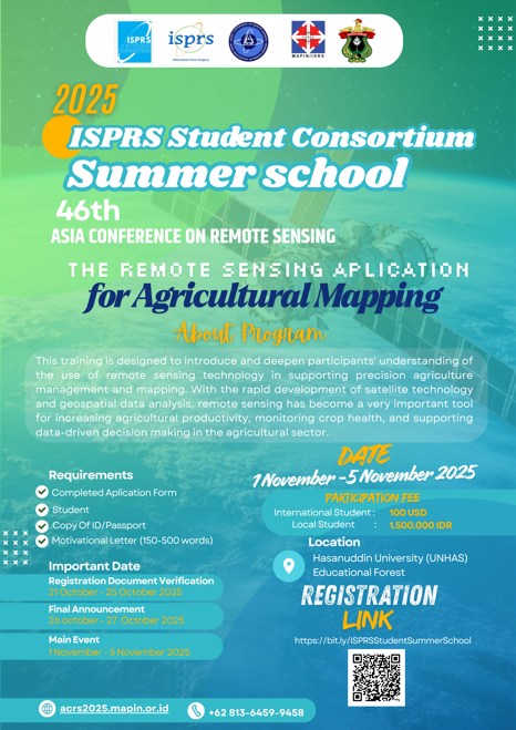 The ISPRS SC Summer School 2025 will be jointly organized by ISPRS SC, Indonesian Society of Remote Sensing (ISRS/MAPIN) in collaboration with the Asian Association on Remote Sensing (AARS) and endorsed by leading institutions.